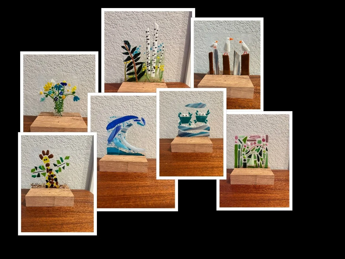 Take 5"x 5" glass base and just create- LOTS of already made decorations or find your inner crafter and use all the excess glass available to make a collage, mosaic, picture or just a playful display of pretty things. Relax - no expectation - JUST FUN. The picture is just a few ideas, but it's YOUR creation!! Go For Itwith!